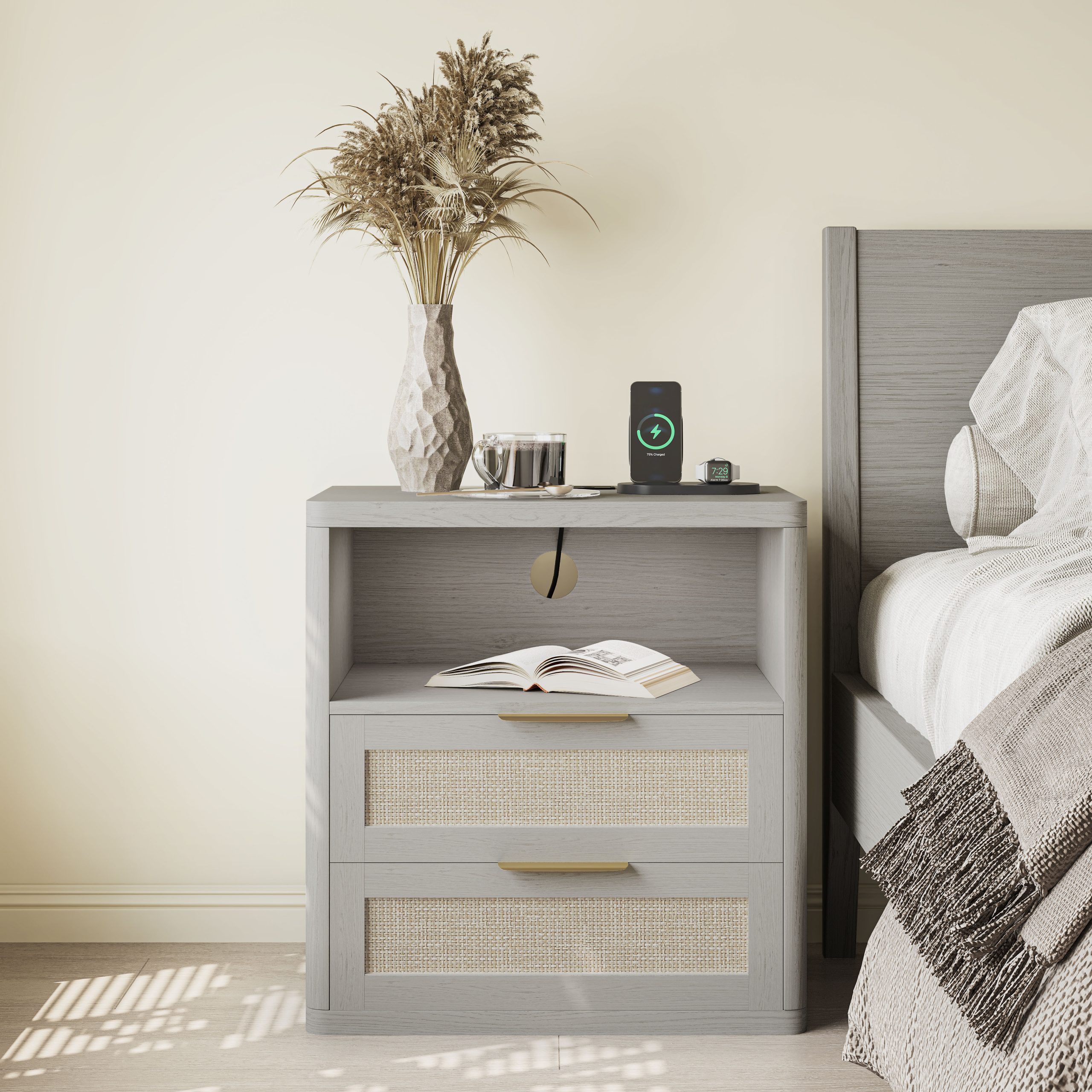 WOSSYO Rattan Nightstand – Grey Oak