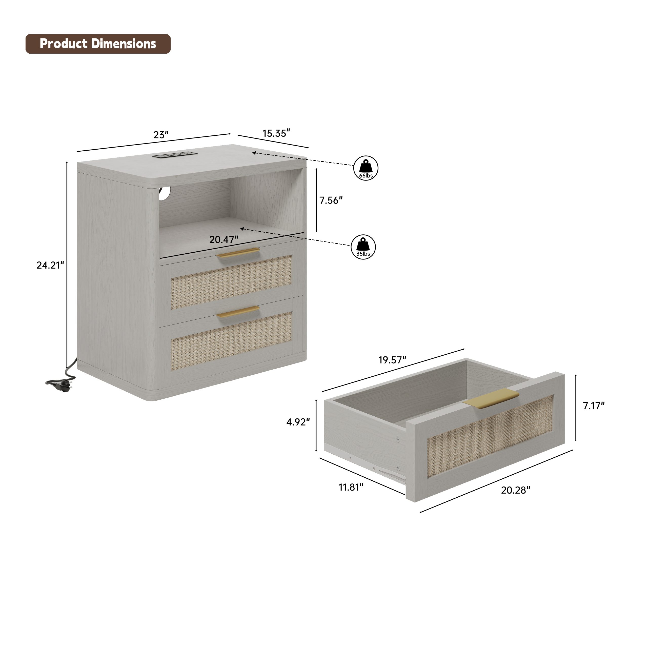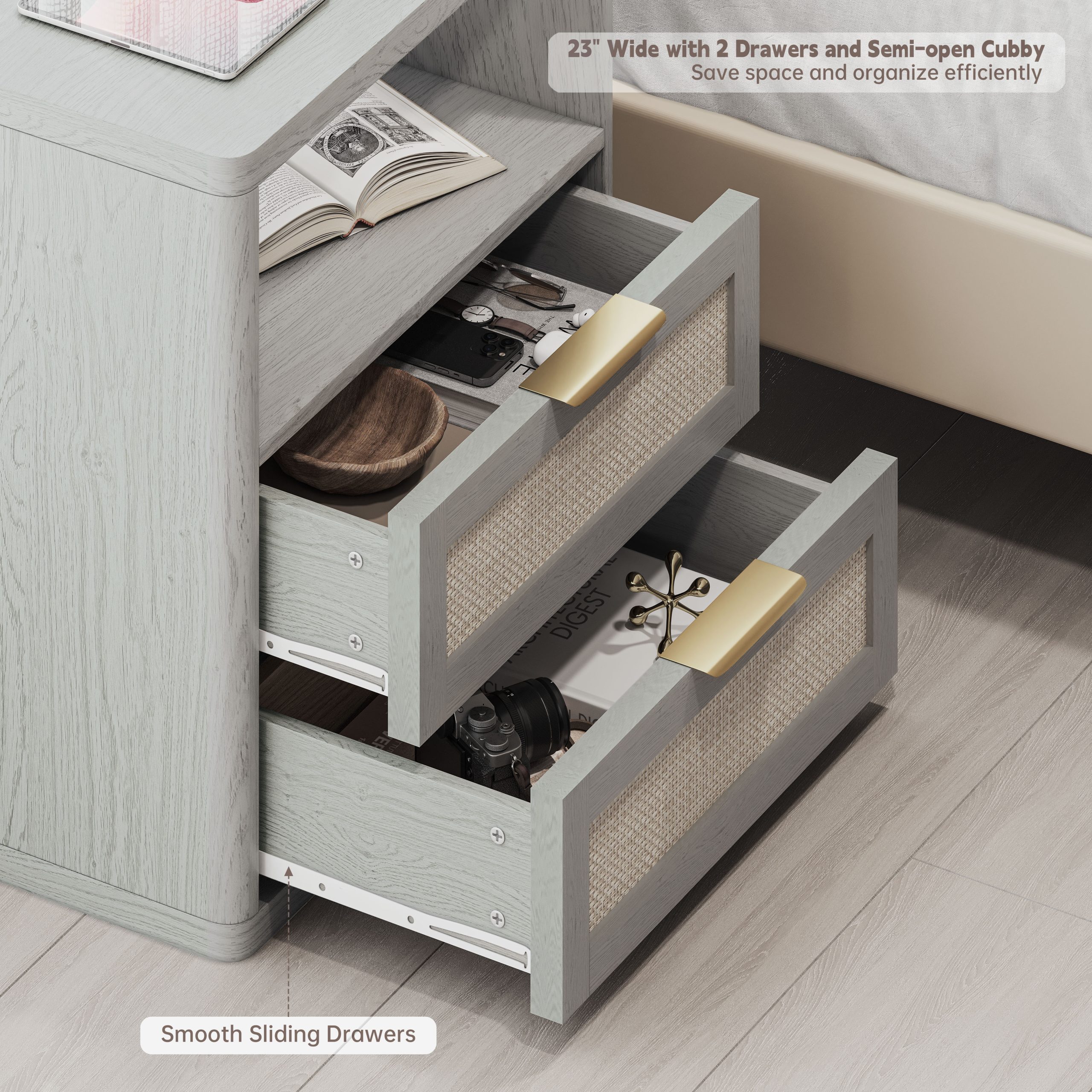 • 【Ample Storage Space 】 Measuring 23″W × 15.4″D × 24.3″H, our nightstand offers a spacious tabletop, two rattan decorated drawers and one semi-open storage shelf. The ample storage capacity ensures that your bedroom remains tidy and organized, accommodating both your favorite bedtime reads and the devices you prefer to keep within reach.