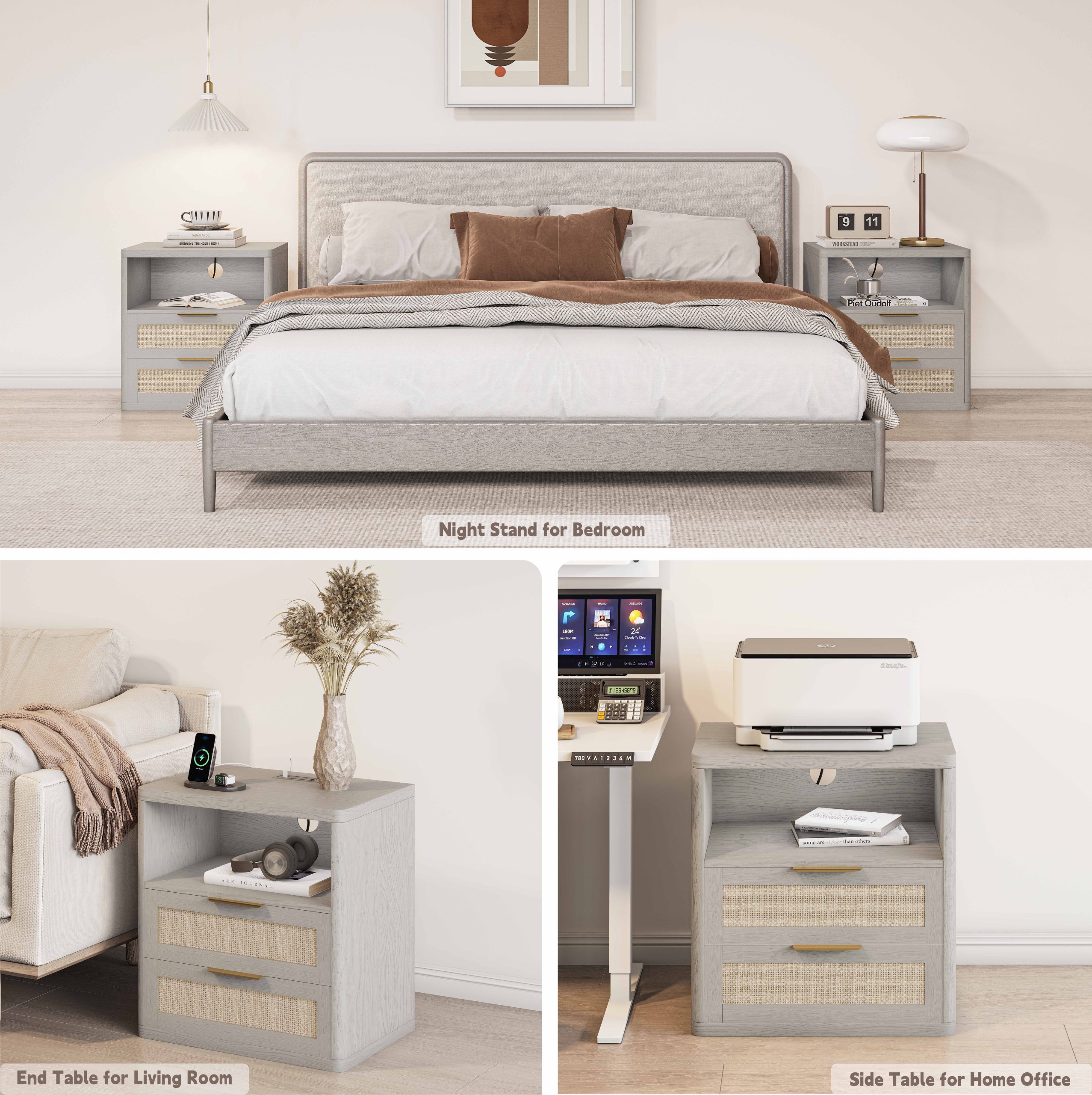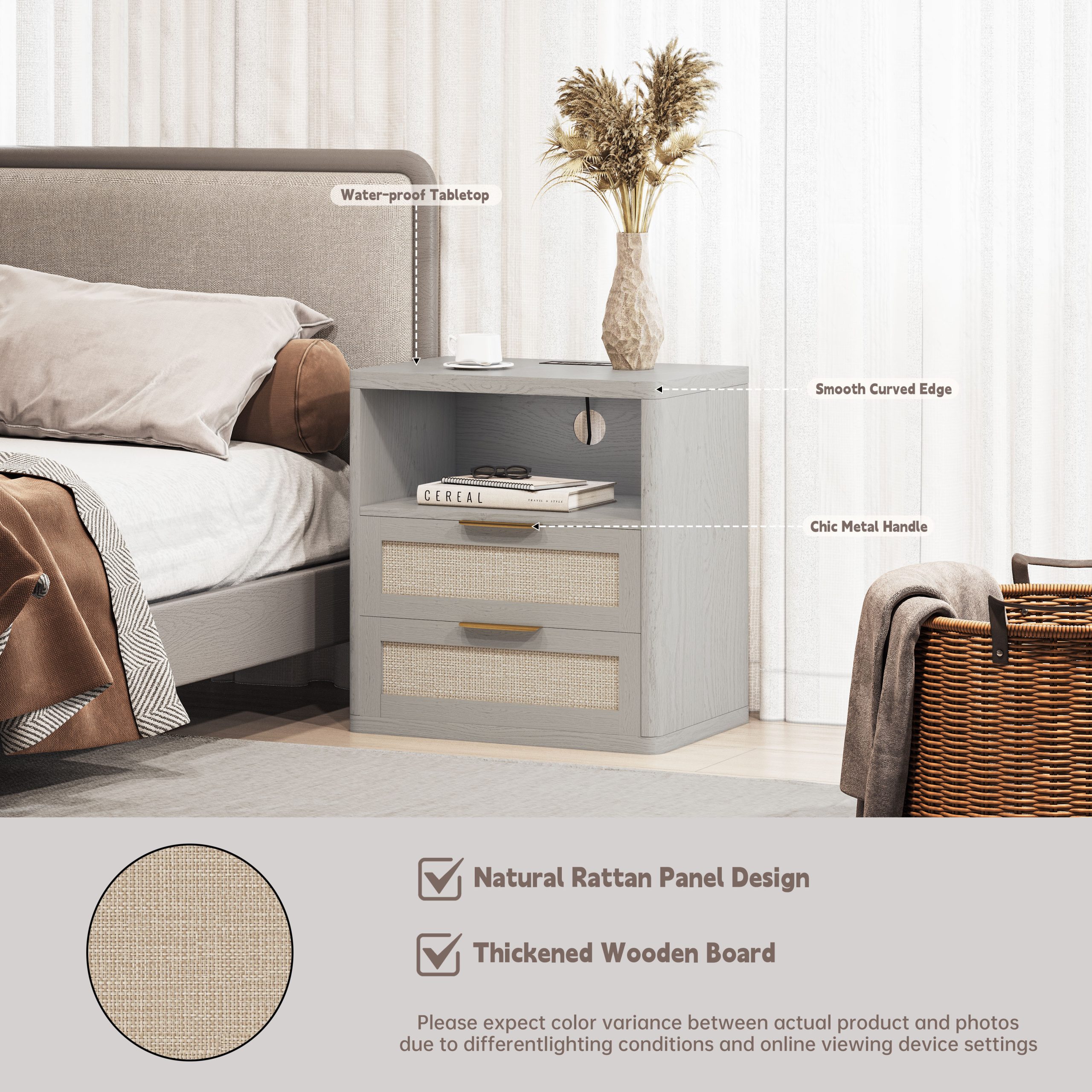 • 【Versatile Rattan Nightstands】 The bedside table with natural oak grain and rattan decorated drawers combining aesthetic beauty with great practicality. Gold metal handle allows you to enjoy a comfortable grip while the rounded corners make it safe for kids and families. This modern night stand can be used not only as a bed side tables but also as a living room end table.